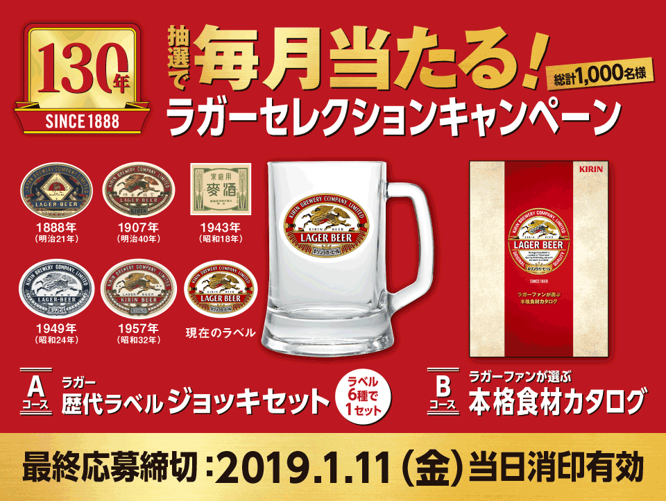 2018/10/25 apricot-manager ■ 応募サイト:キリンビール ■ 締切日:2019年01月11日 ■ 抽選で1,000名様 キリンラガービールなどを抽選で1,000名様にプレゼントいたします。 応募には対象商品の応募シールが必要です。 応募はこちらから