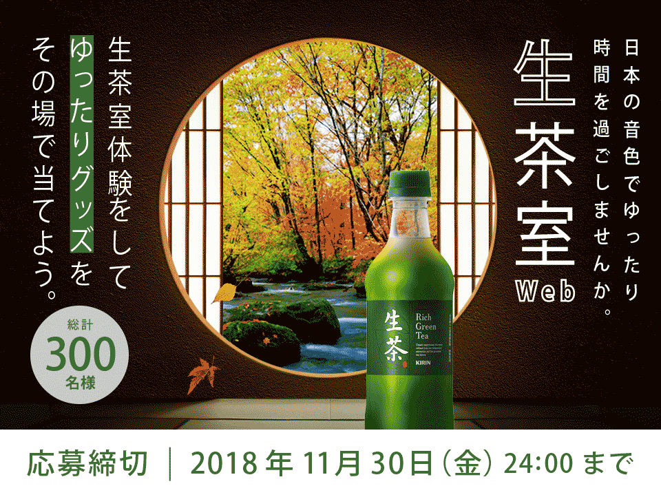 2018/11/23 apricot-manager ■ 応募サイト:キリンビール ■ 締切日:2018年11月30日 ■ 抽選で300名様 生茶 ゆったりグッズを抽選で300名様にプレゼントいたします。 応募はこちらから