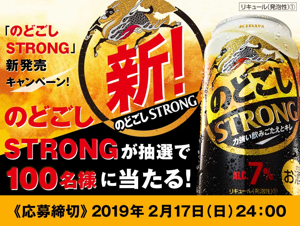 2019/01/24 apricot-manager ■ 応募サイト:キリンビール ■ 締切日:2019月年02月17日 ■ 抽選で100名様 キリン のどごし STRONGを抽選で100名様にプレゼントいたします。 当選の発表は賞品の発送をもってかえさせていただきます。 応募はこちらから