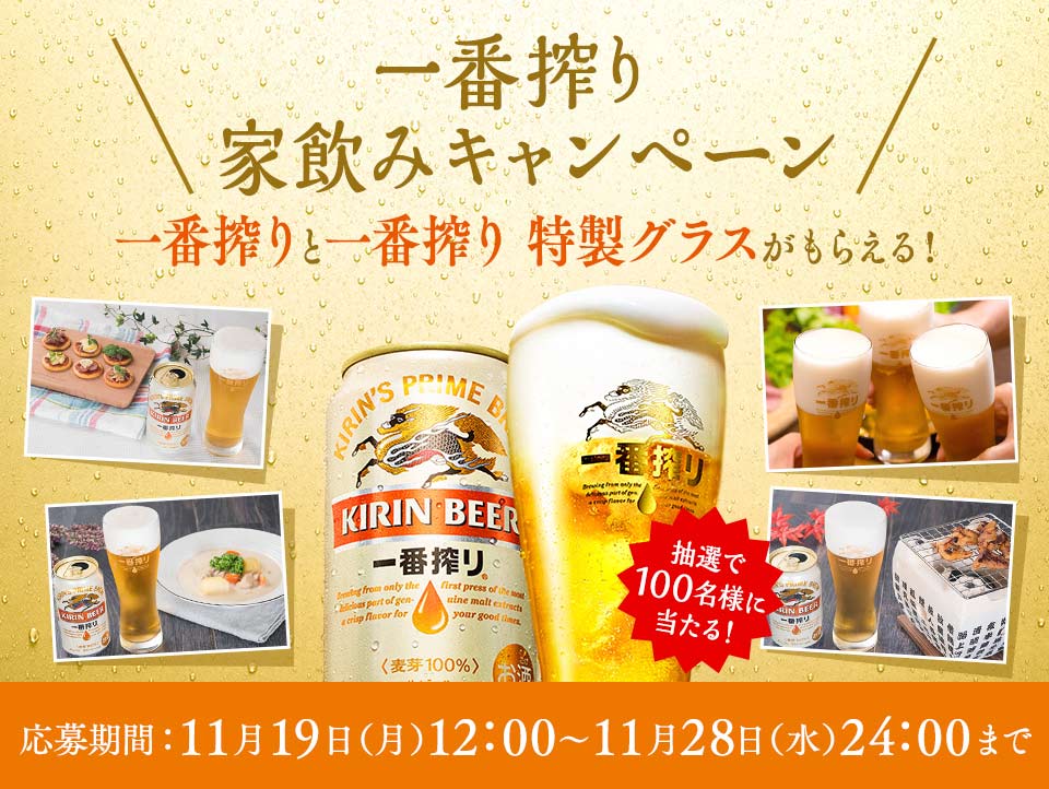 一番搾りと一番搾り特製グラスを抽選で100名様にプレゼントいたします。