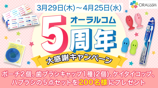 ポーチ2個、歯ブラシキャップ1種(2個入)、ケイタイコップ1個、ハブラシ1本の5点セットを200名様にプレゼント