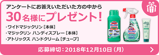 『ワイドマジックリン[本体]』、『マジックリン ハンディスプレー[本体]』と『アトリックス ハンドクリーム』をセットでプレゼント。