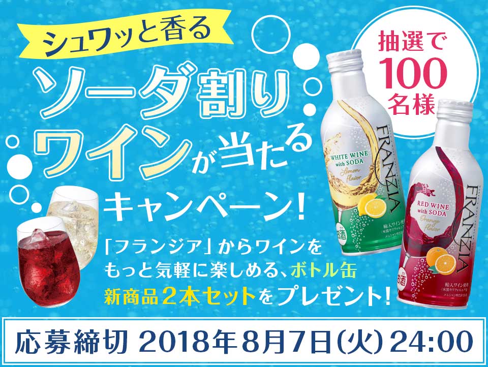 「フランジア レッドワイン ウィズ ソーダ オレンジフレーバー」、「フランジア ホワイトワイン ウィズ ソーダ レモンフレーバー」各290ml缶1本、2本セットを抽選で100名様にプレゼント